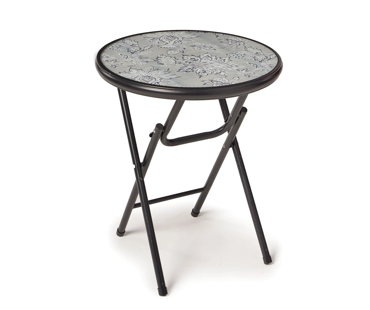 Dine in your favorite outdoor spots with the style and function of this folding table from Real Living! Made with a tempered glass tabletop featuring a neutral floral print, the black powder coated steel frame folds so that storage and set up stays simple. This table is perfect for use on the deck, porch, backyard and more!