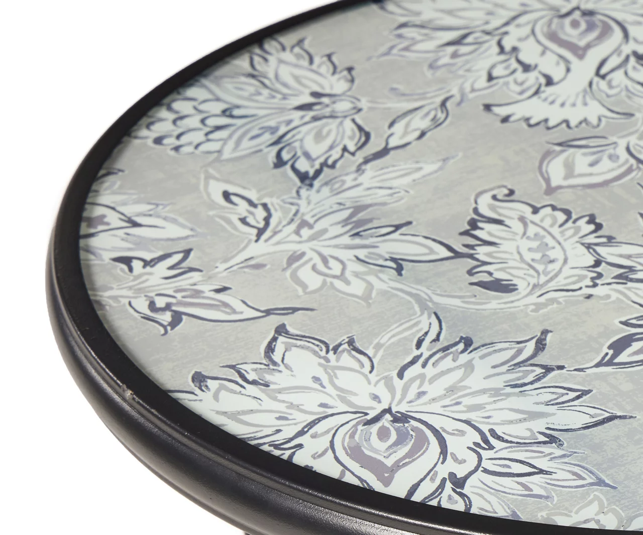 - Tempered glass top with gray floral pattern
