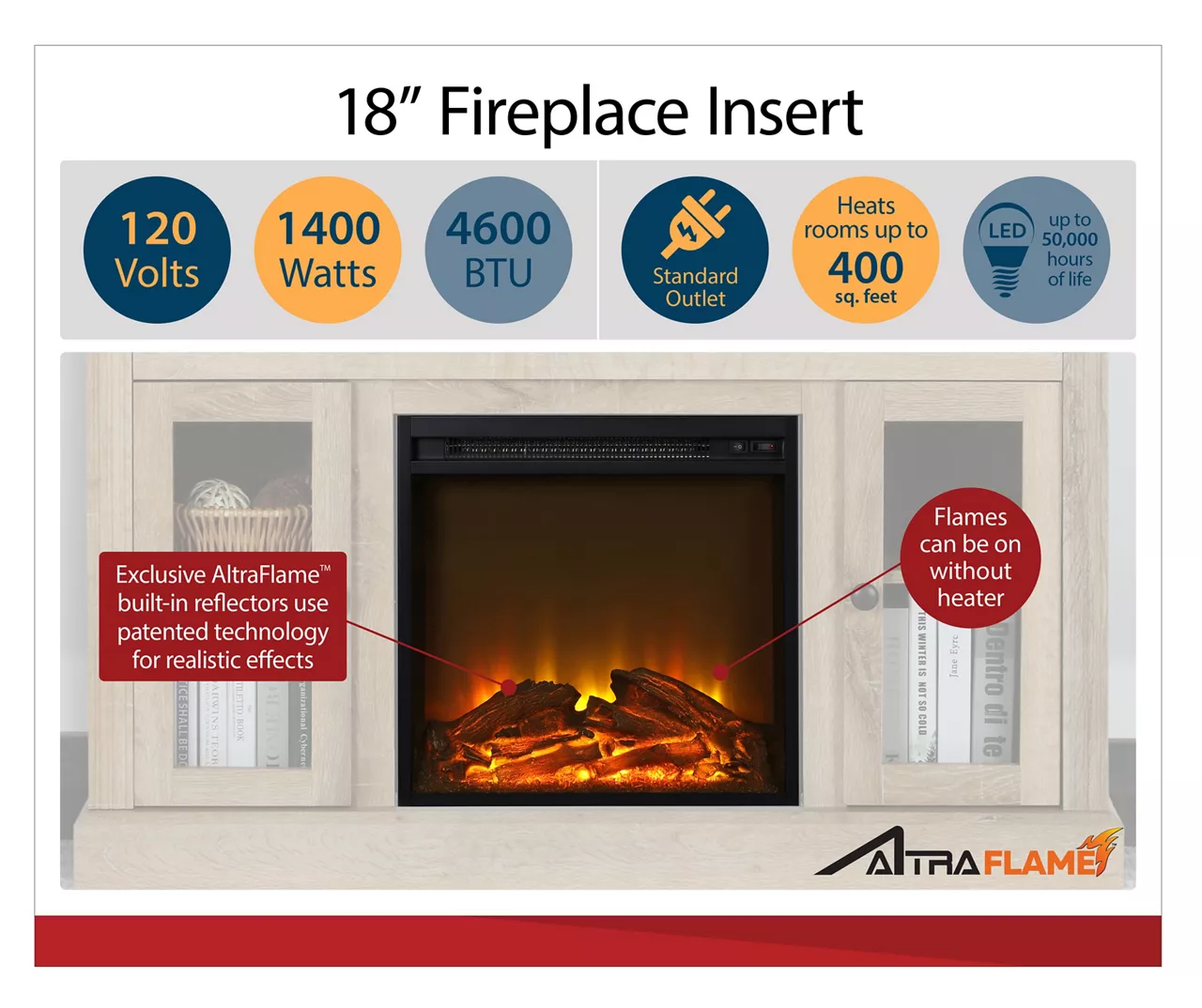 - The 18″ electric fireplace insert features a realistic flame effect that can be used with or without heat