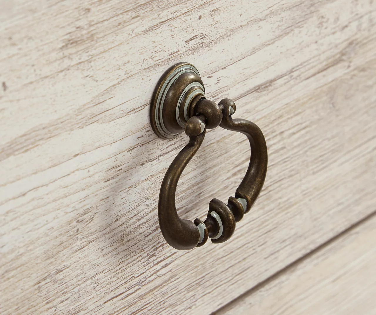 - Ring pull hardware in an antiqued brass-tone finish