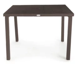 Gather outdoors for conversation and delicious meals around the Asheville dining table by Broyhill. The square shape table features a powder-coated steel frame hand painted to look like wood with a slat-style top. Complete with a convenient umbrella hole for shading your favorite spot, this dining table is an elevated addition to a patio or deck.