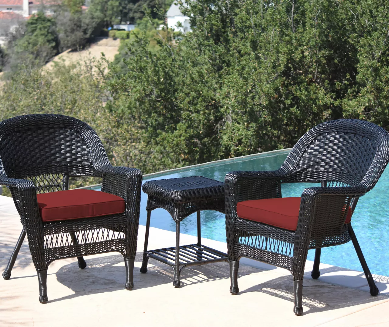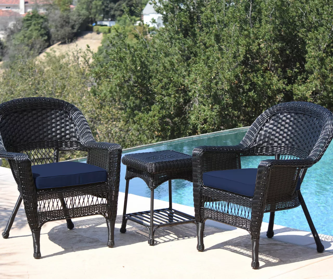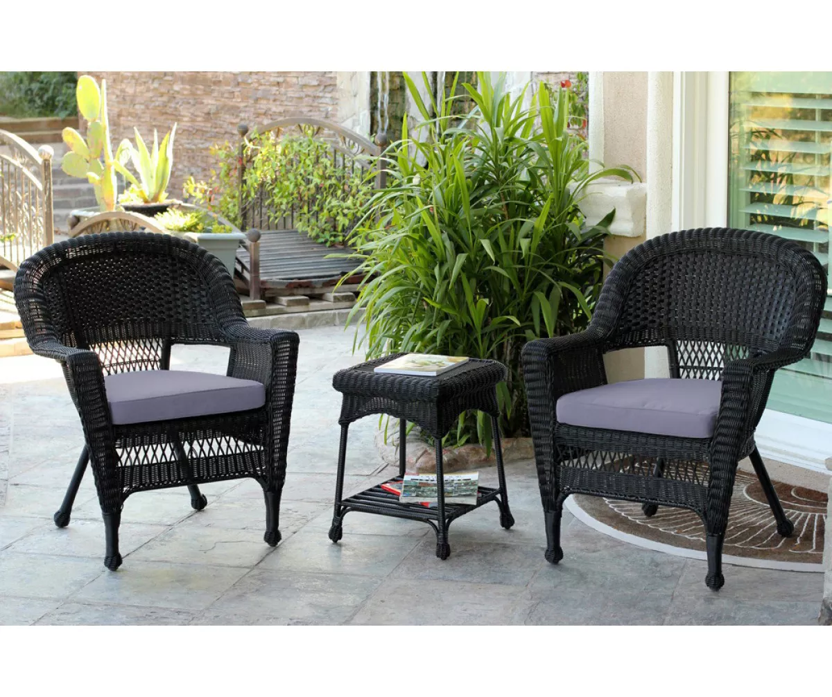 Relax in the fresh air and sunshine using this lovely chat set. The two chairs and matching end table are each made with a powder-coated steel frame wrapped in handwoven all-weather wicker featuring a black finish. Topped with UV-protected foam seat cushions in a turquoise hue, this set is perfect for your patio, deck or porch.