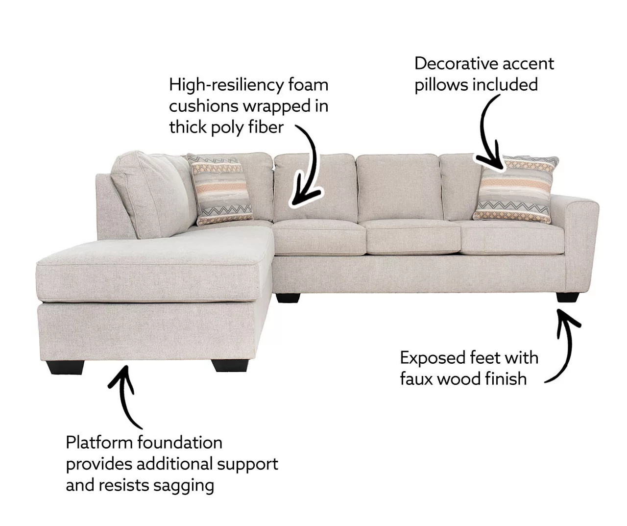 - Contemporary style sectional with left-arm-facing corner chaise and right-arm-facing sofa