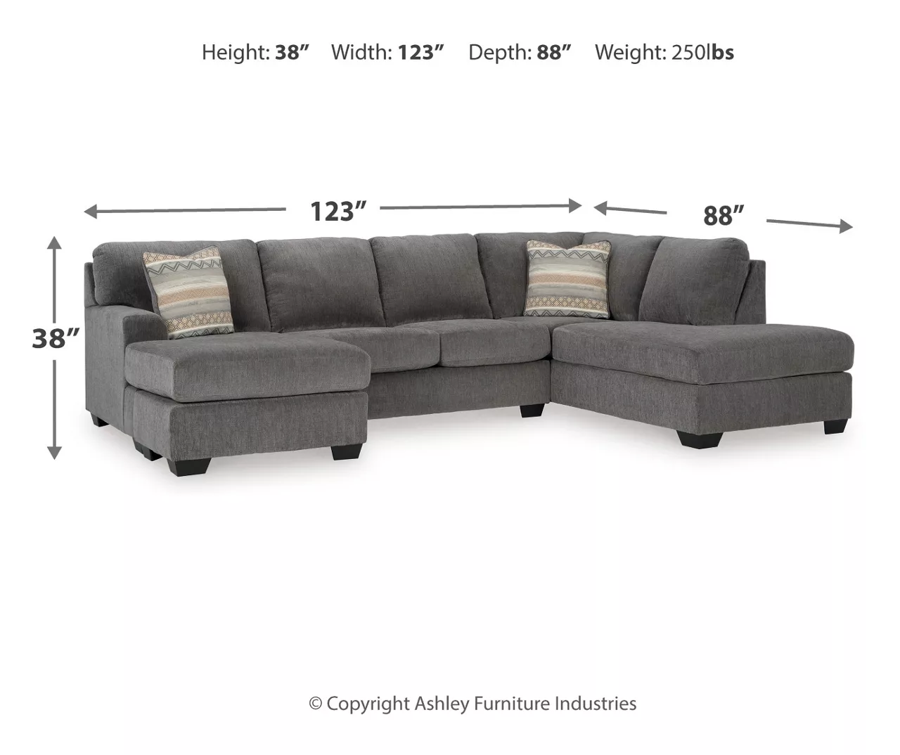 - Right-arm-facing corner chaise product dimensions: 87″L x 37″W x 38″H
