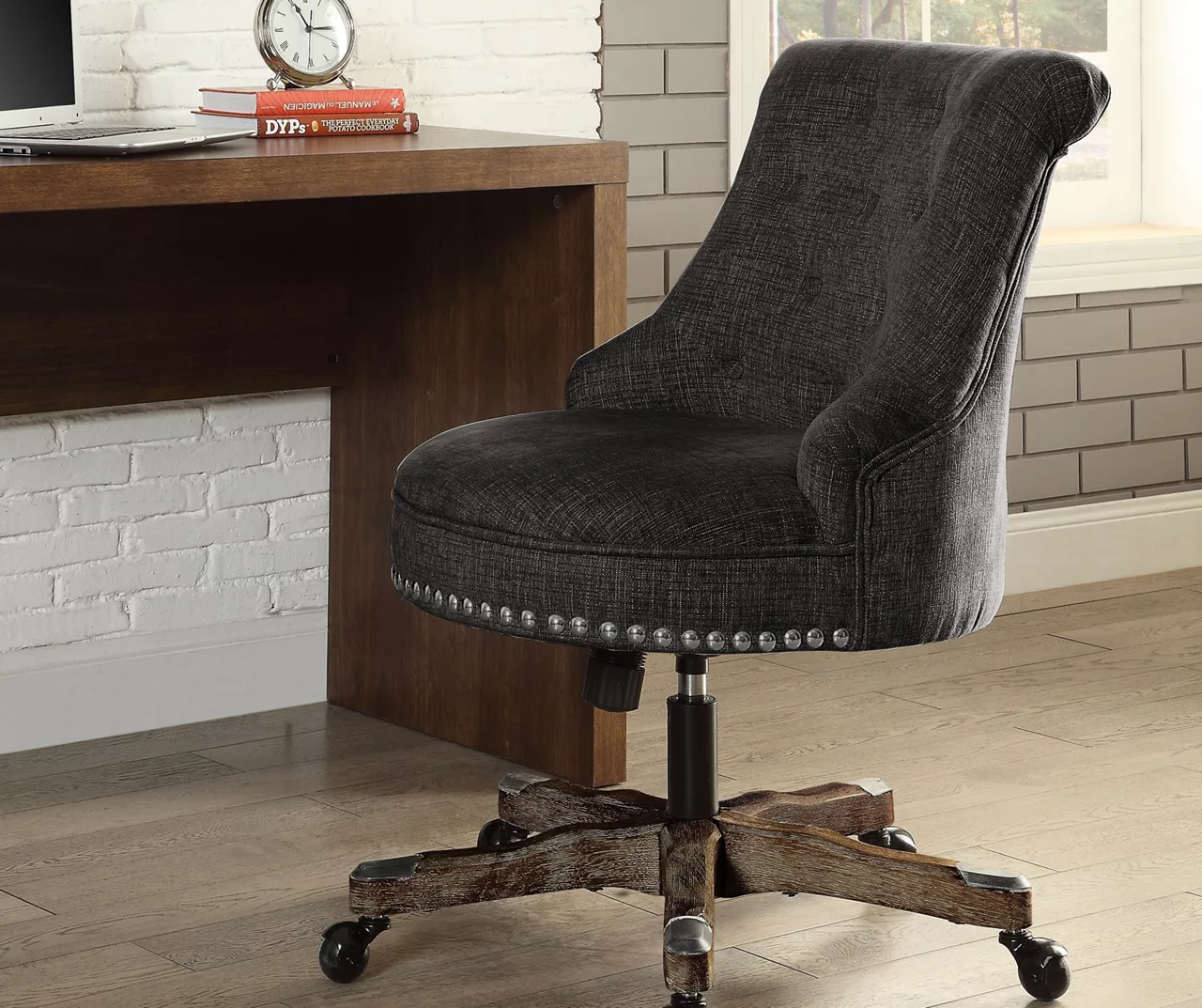 Add dynamic style to your work space using this sleek charcoal gray desk chair. A tall back features decorative button tufting for extra comfort as its padded round seat provides relaxation underneath. Featuring nailhead trim along the seat’s bottom and a decorative wooden base, this chair is perfect for a writing, computer or work desk.