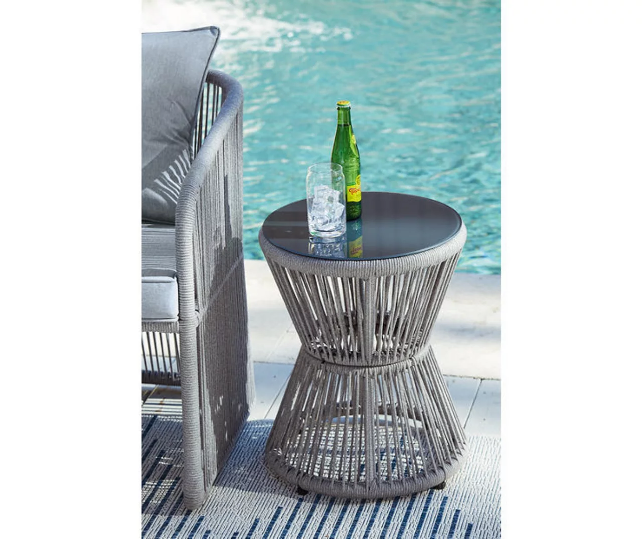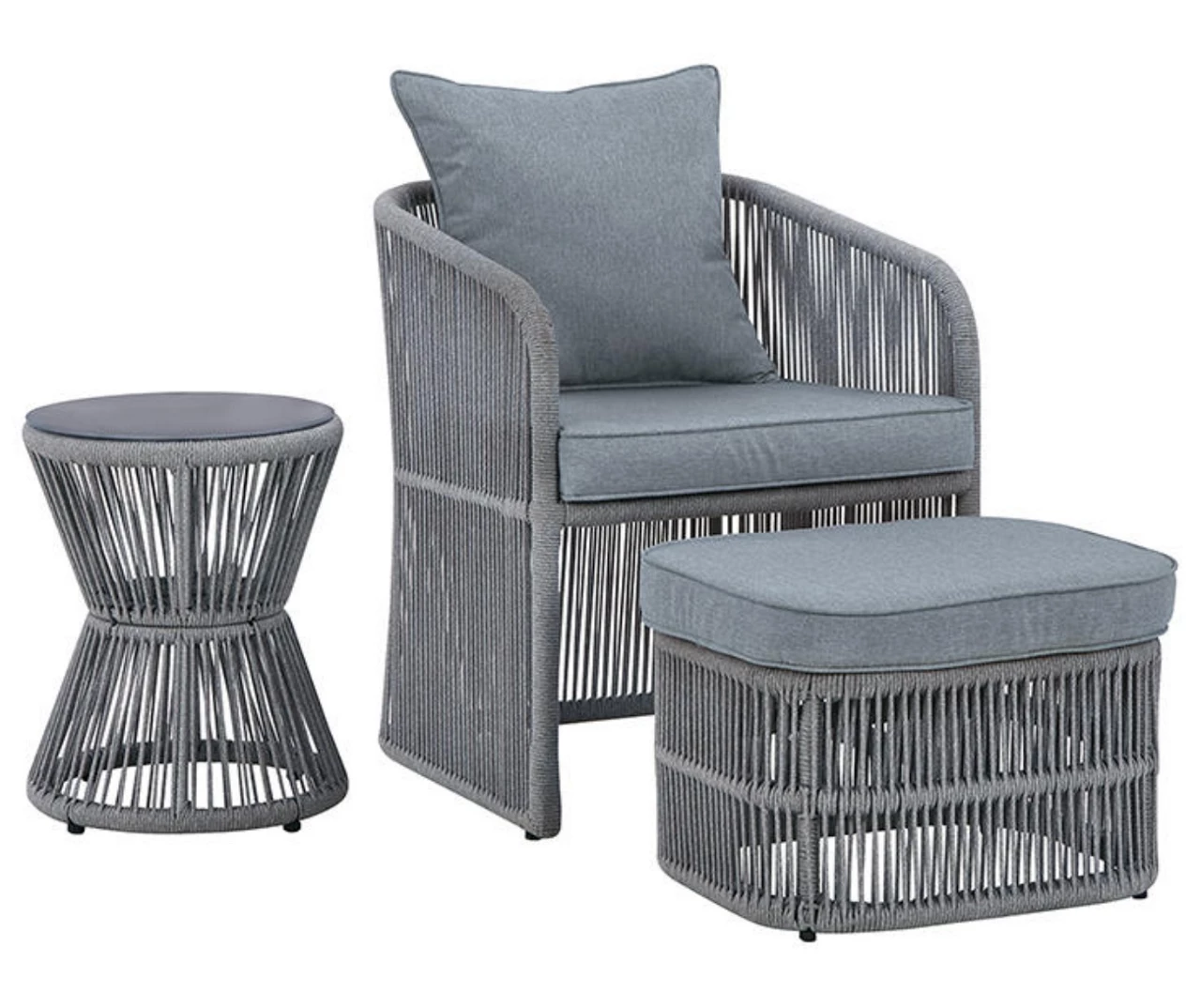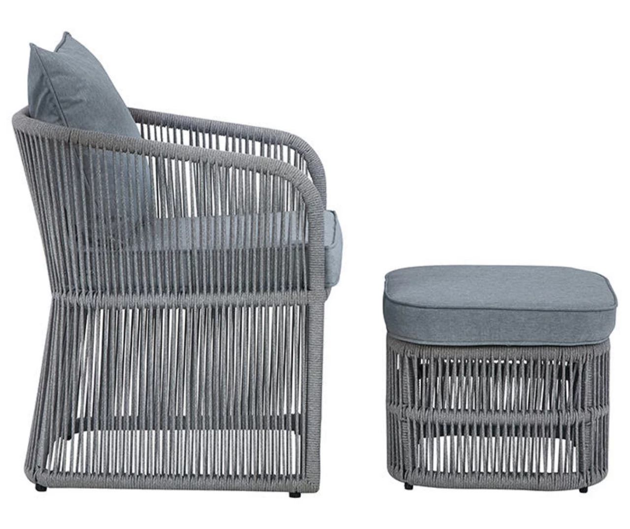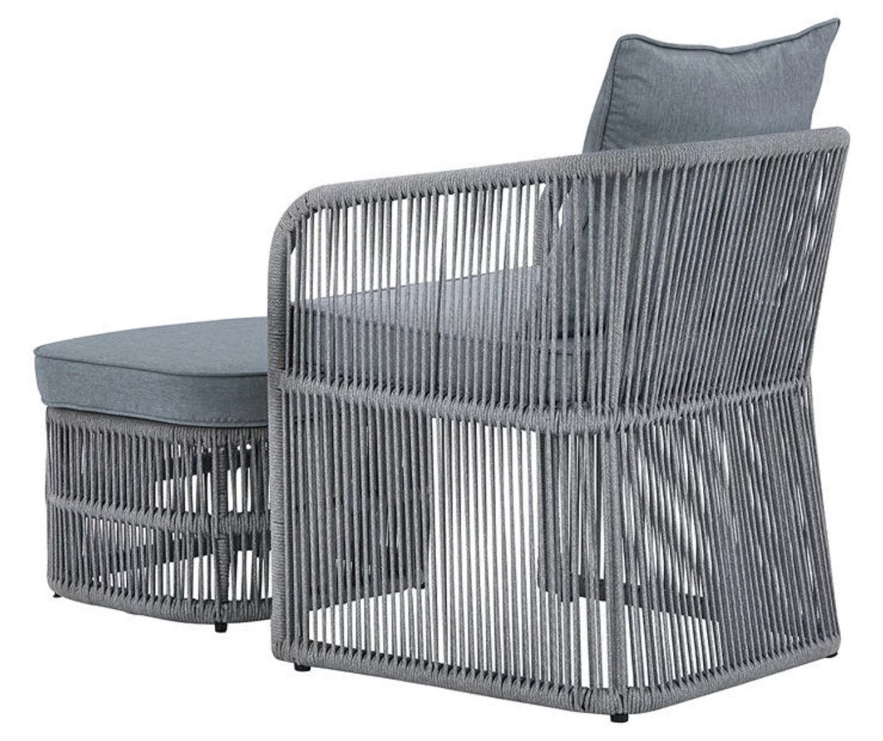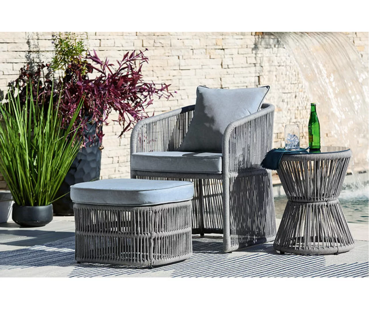 On-trend with its monochromatic design, this outdoor chair with ottoman and side table is primed for casually cool relaxation. Gray rope material woven on a durable steel frame has a subtle-yet-dynamic sense of style. A tempered glass tabletop is the perfect place for drinks and snacks, while the self-storing ottoman offers a spot for tired feet to rest while you’re chilling alfresco. All-weather cushions, covered in easy-to-clean Nuvella fabric, round out the look.