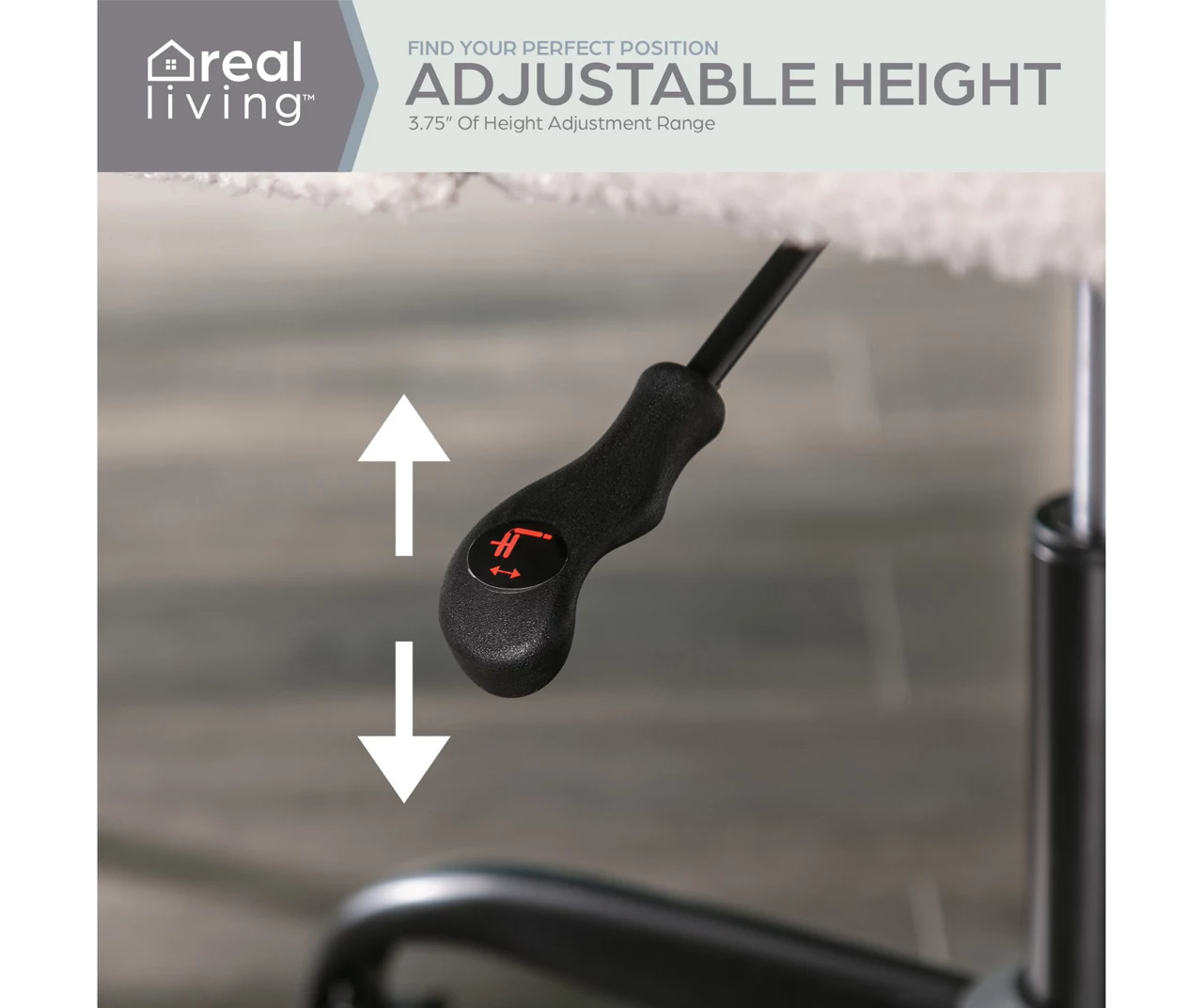 Work and play in modern style with this office chair from Real Living! Upholstered with soft faux wool boucle fabric in a cream white color, this armless desk chair is equipped with a 360° swivel seat and caster wheels along with an adjustable height. It’s perfect for daily tasks and work sessions in a dorm, home office or study.