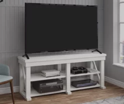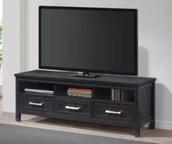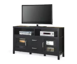 Bring vintage charm to your living room or family room using the Ameriwood Deveronne TV stand. The beautiful ivory oak woodgrain finish gives the TV Stand the look of real wood for an affordable price with decorative side details that add a unique and elegant look. Three lower shelves provide space for your cable box, DVD player and gaming consoles as wire management holes make it easy to plug in your electronics. Store away remotes, DVDs and games in the three open drawers that feature durable metal slides to make opening and closing each drawer smooth and simple.