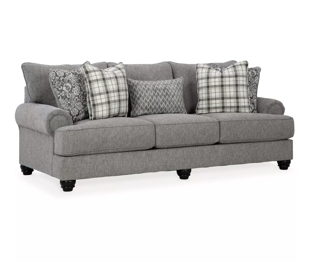 A triumph in transitional design, this sofa invites you to indulge in eye-catching texture and cozy comfort. Flared roll arms and loose, reversible cushions give this classically styled sofa a sense of everyday ease. Accent pillows add a wonderful layer of interest.