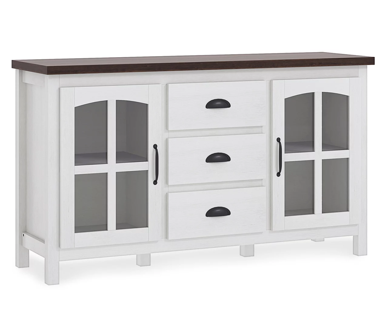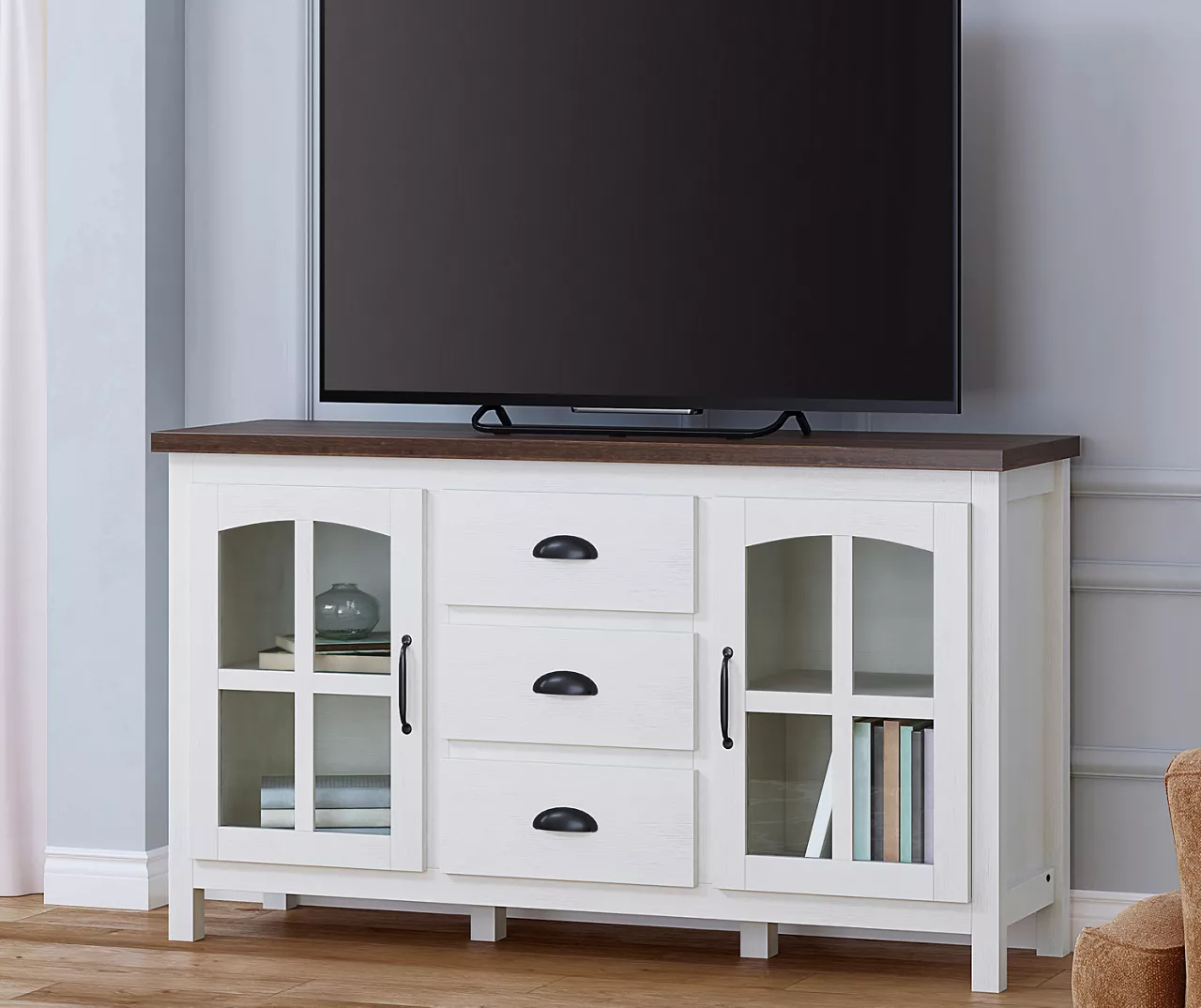 Add a farmhouse touch to your living or entertaining area using this inspired Stratford TV stand. Its two-tone design features a beautiful whitewash base paired with a rustic dark brown top. Tempered glass doors open to reveal inner shelving for storing your media, accessories and more as the three drawers hold smaller items such as remotes or batteries.