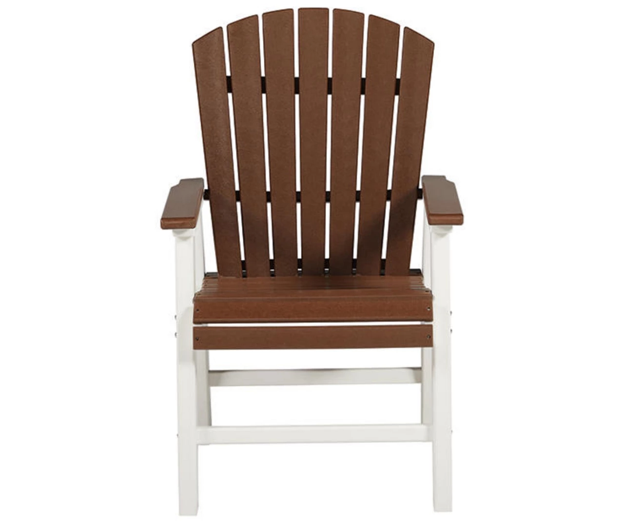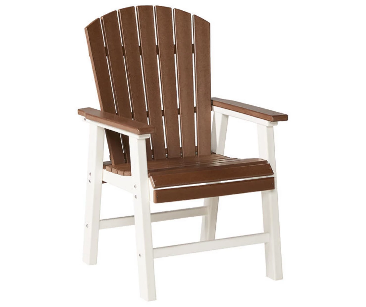 Pull up a chair on the back deck or poolside and gather around for good times. These outdoor dining armchairs have sturdy legs in crisp white and arms, seat and back in a soft shade of brown. The slatted seat and back allow drainage to prevent rainwater buildup. Designed to withstand harsh weather elements, this comfortably casual outdoor duo features stainless steel hardware and is made of durable Mega Tuff HDPE material that won’t chip, rust or peel.