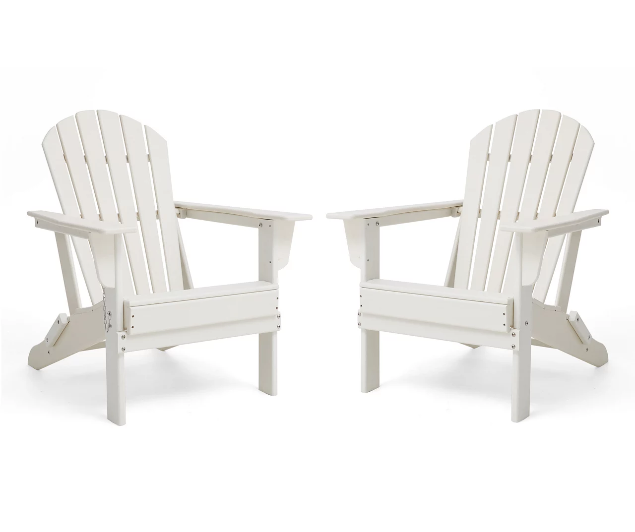 This set of two Adirondack chairs lets you enjoy casual conversations and happy hours with friends in your outdoor space. Each chair is constructed of durable and all-weather resistant high density polyethylene, making them easy to clean with little maintenance. The folding design of the chairs are great for when you need to take them on the road as slanted seating and full backs hug you in comfort. This versatile folding Adirondack chair set is perfect for your patio, porch, poolside, garden, backyard or any other outdoor space!