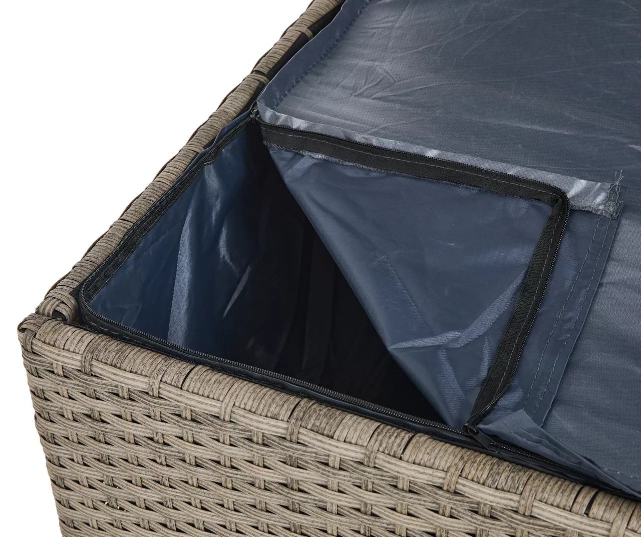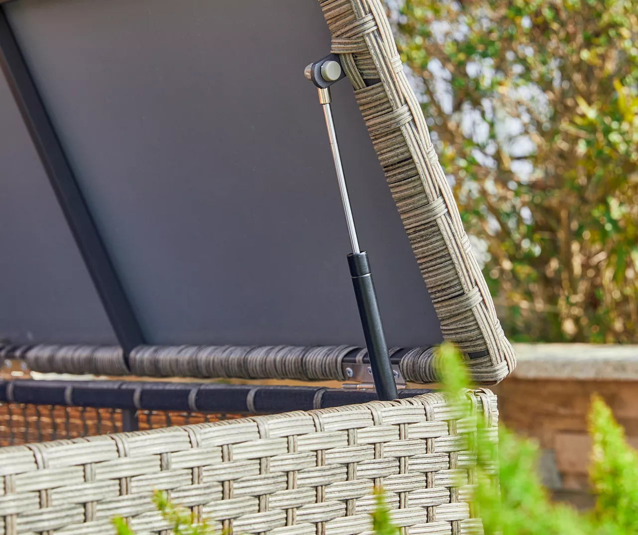 Store your outdoor accessories in style using this Glitzhome storage box! Its powder-coated steel frame is handwoven in all-weather wicker featuring a stylish gradient blend of gray and cream colors. Constructed with a pneumatic lid system that keeps it open while in use, this storage box with a waterproof liner is the perfect solution for tidying up your backyard.