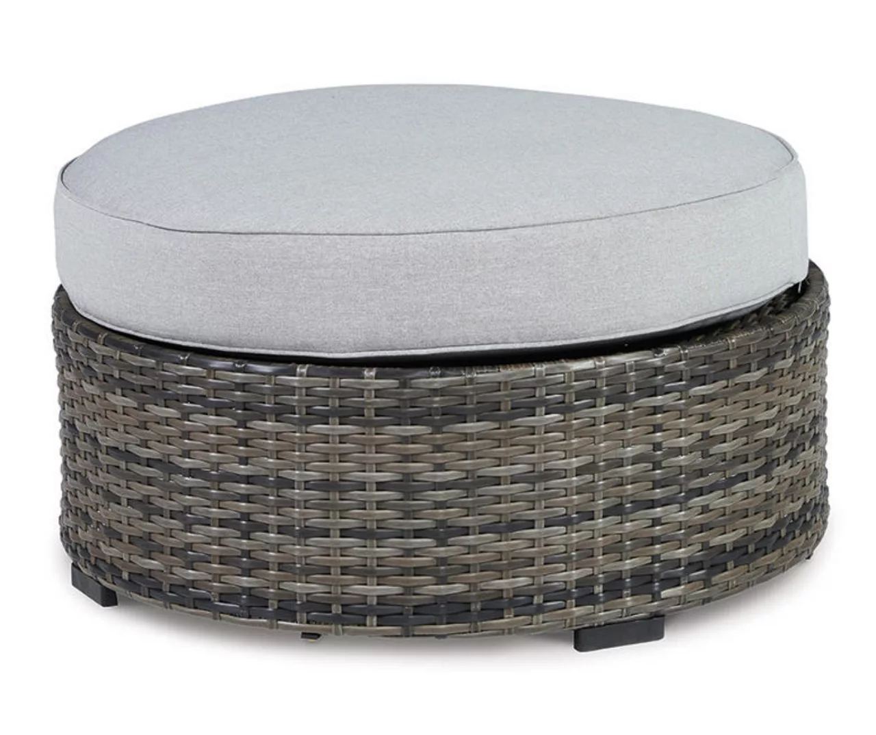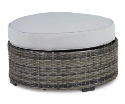 This cool, casual outdoor ottoman will raise the comfort level and visual appeal of your outdoor living space. Made of handwoven wicker in neutral tones of light and dark gray, the cushioned ottoman blends beautifully into your sunroom or pool and patio area with a comfy cushion wrapped in Nuvella high performance fabric that is stain resistant, fade resistant and easy to clean.