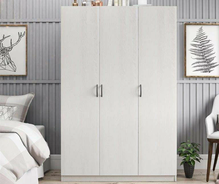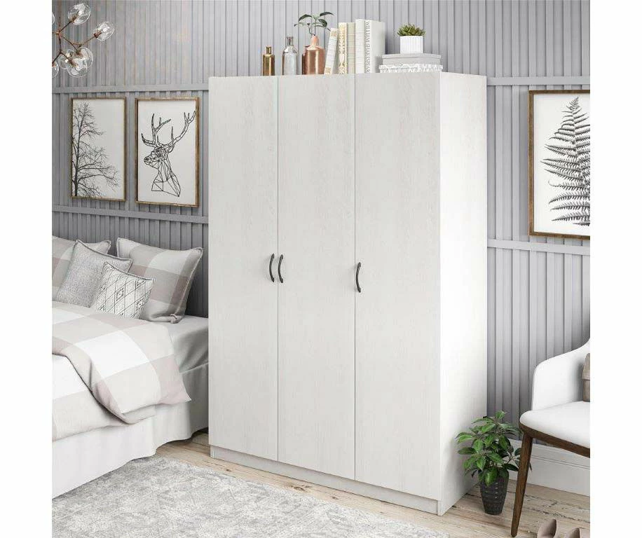 The Ameriwood Home three door wardrobe gives you the closet space you need to organize all of your clothes. Made of laminated particleboard, the ivory oak woodgrain finish gives the wardrobe a trendy weathered look. Behind the right door are two fixed and two adjustable shelves that are perfect for organizing shoes, sweaters and jeans. Open the two left doors to reveal a large space with a hanging rod and extra shelf for hanging dresses, dress pants and t-shirts. The shelf can be used to store seasonal items like scarves and gloves to keep your room clutter free. Use it in your bedroom to add much-needed closet space or in the entryway to create a mudroom to hang coats and organize shoes.
