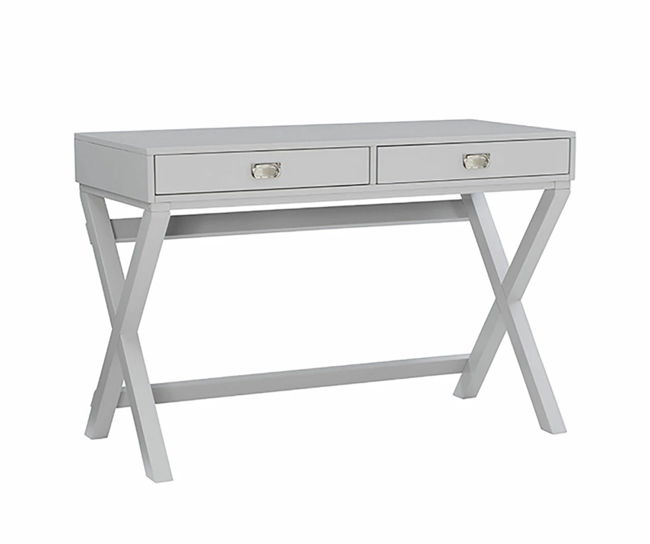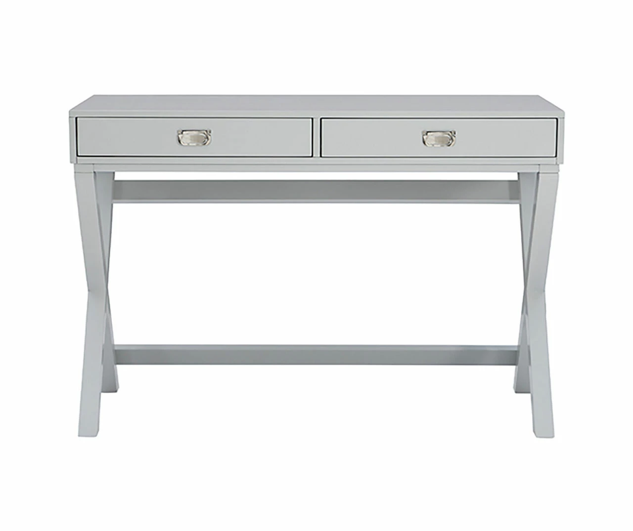 Make work fun with this campaign style writing desk. Finished in grey with silver hardware, this desk will add color and life to any space. The X-framed legs provide a study foundation for a work space, while its two drawers provide ample space for supplies.
