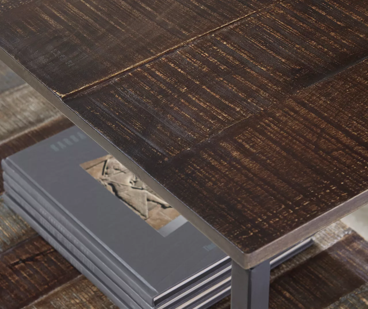 - Distressed brown, gray and white finish center shelf and tabletop for open storage and display