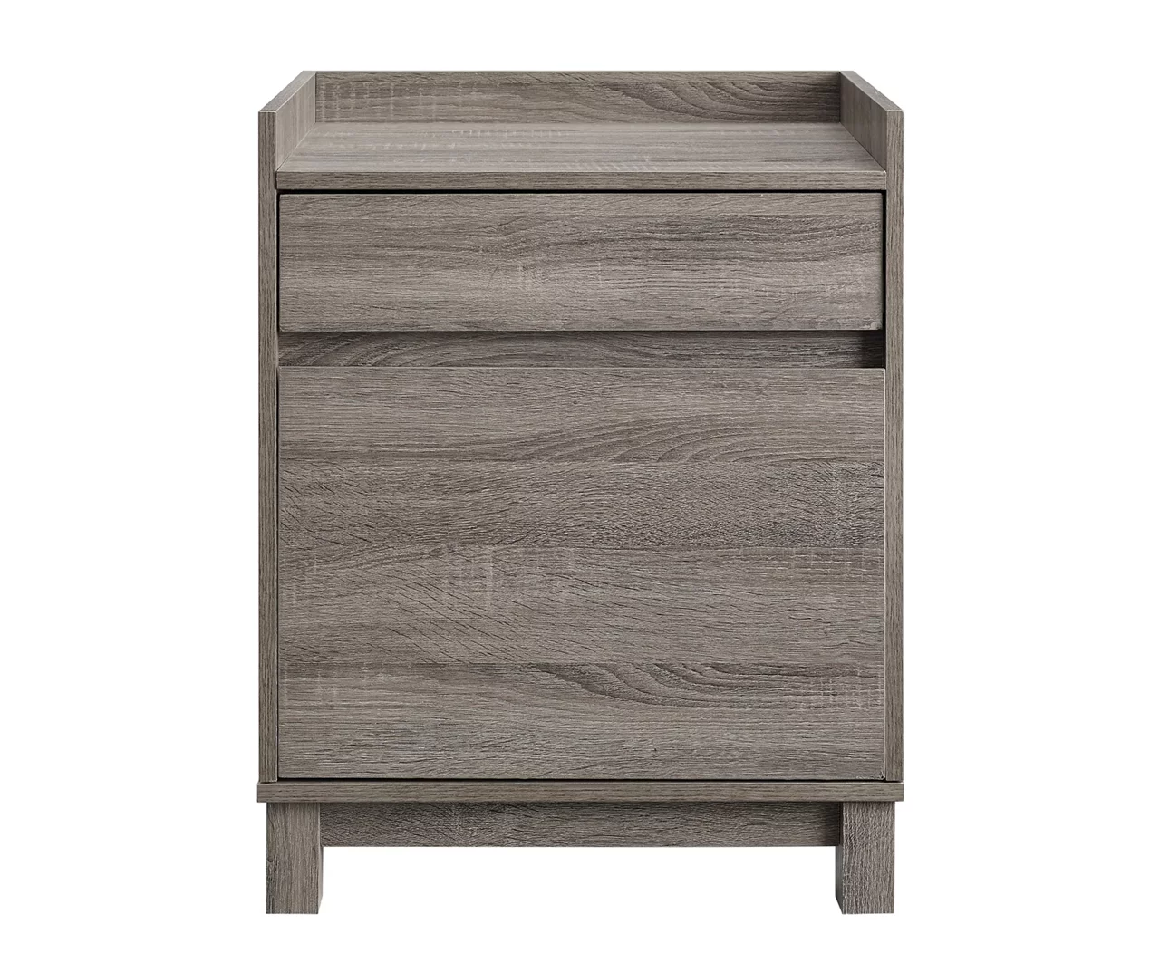 Perfect for adding storage to your space, this Margo filing cabinet features two large drawers and a spacious top surface for storing or displaying office essentials. The bottom drawer is outfitted for hanging file folders while the smaller drawer is perfect for keeping notepads and pens within reach. The gray finish with textured woodgrain easily complements a range of décor styles in the home office, bedroom or dorm.