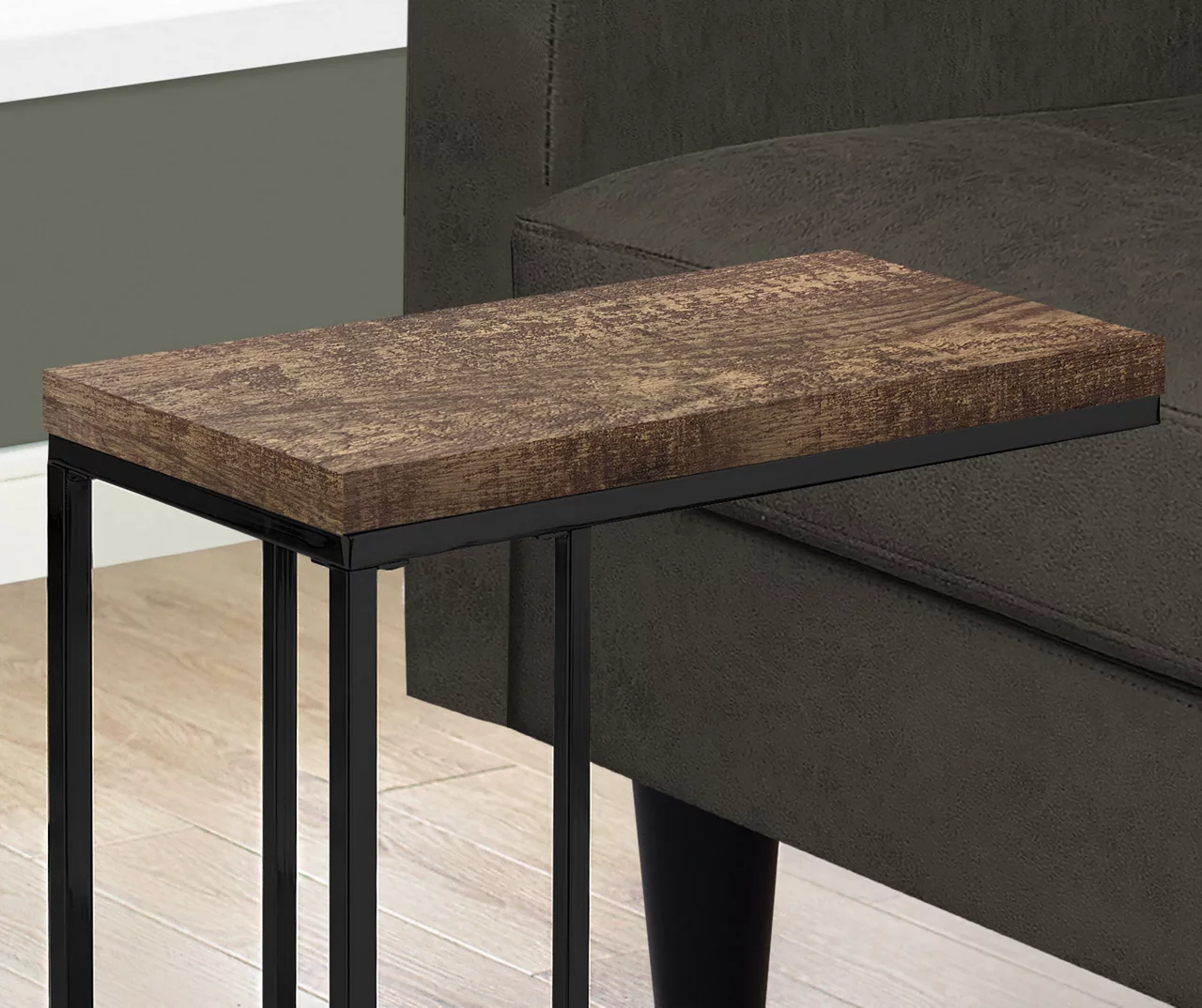 - With a trendy rustic-look textured surface, this C-shape side table slips easily under your sofa, chair or bed