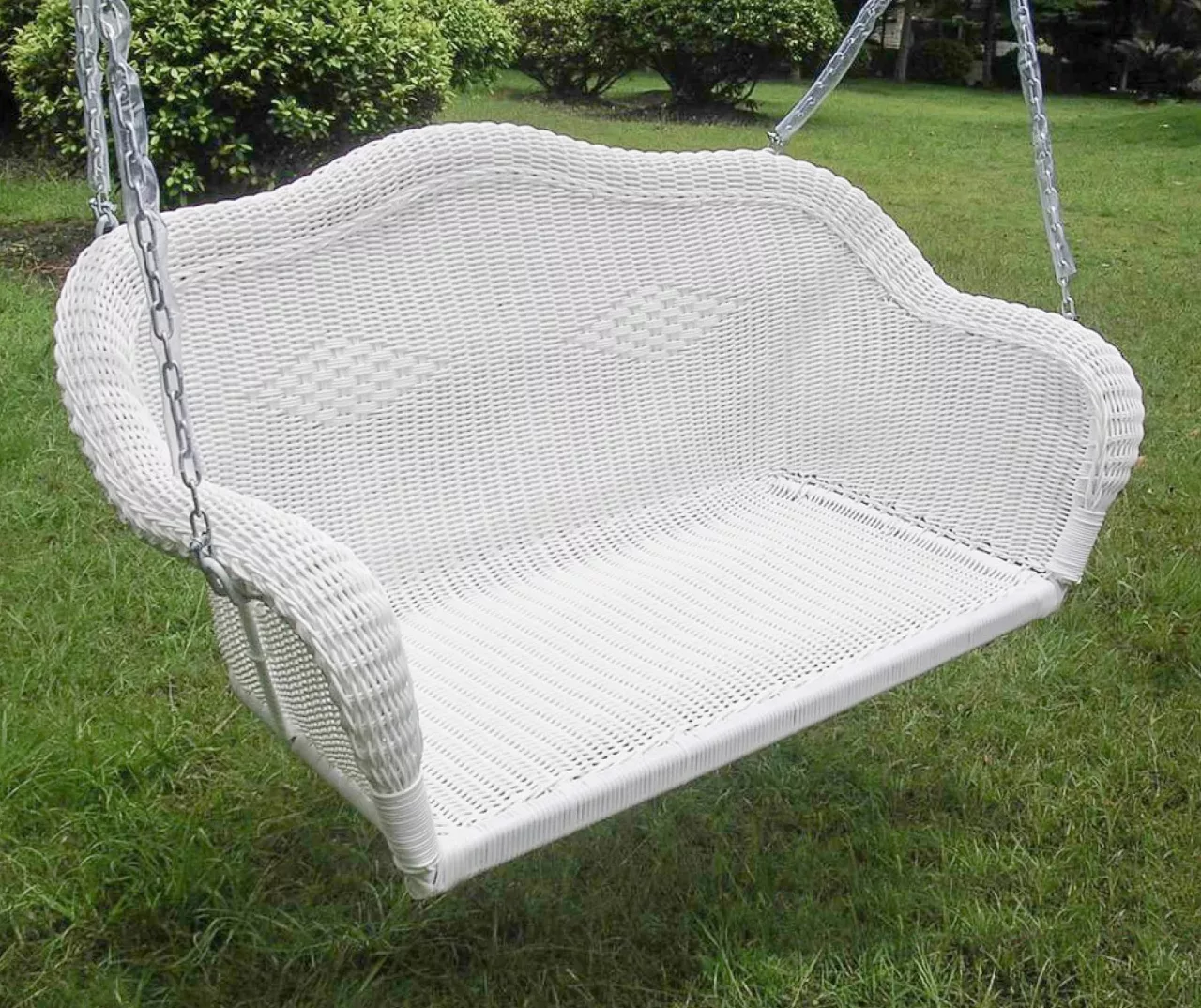 Add this beautifully hand-woven resin wicker swing to your porch or patio and relax while watching the sunset or simply catch some fresh air while reading a book. This all-weather swing has a traditional wicker design with hand-woven lattice work and a diamond pattern. Resin wicker is flexible and fade-resistant for lasting functionality while the powder-coated steel frame is sturdy for extra durability. It offers comfortable seating for two people and comes with hanging chains and hooks included. Simply mount the swing to your porch or patio and get ready to enjoy those summer evenings at home.