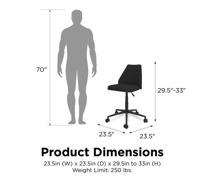 The Novogratz Brittany Office Chair with Casters is the ideal mix of modern and mid-century! Stuffed with comfortable foam cushioning, this armless chair delivers both style and flair. It has been crafted with a durable wood frame construction and rich linen upholstery. The Brittany features a ribbed tufted cushioned back with piping details and metal legs. Its iconic design provides ample back support to allow you to sit in complete comfort while working on your computer at your desk, reading the latest bestselling novel or catching up with the latest gossip on your tablet.