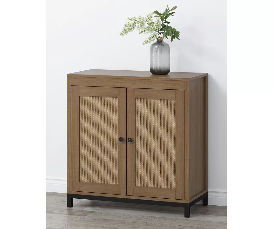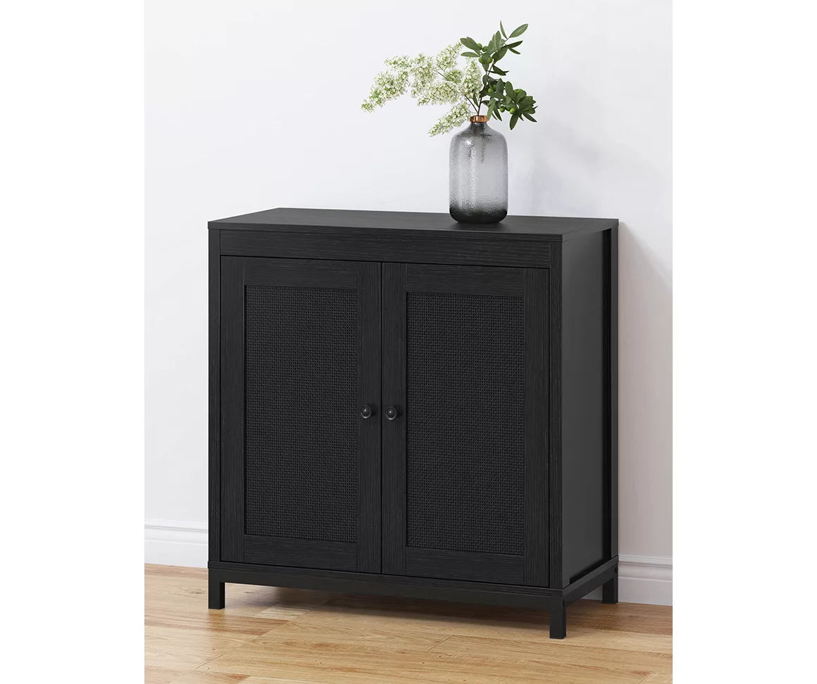 Keep your home organized in style using the Seven Hills cabinet from Real Living! Decorative cane inserts accent each door that creates concealed storage for your items. Finished in a rich acorn brown color that contrasts with a raised black base, this cabinet is a stunning addition to an entryway, living space or dining room.