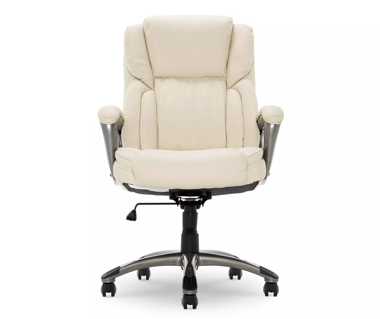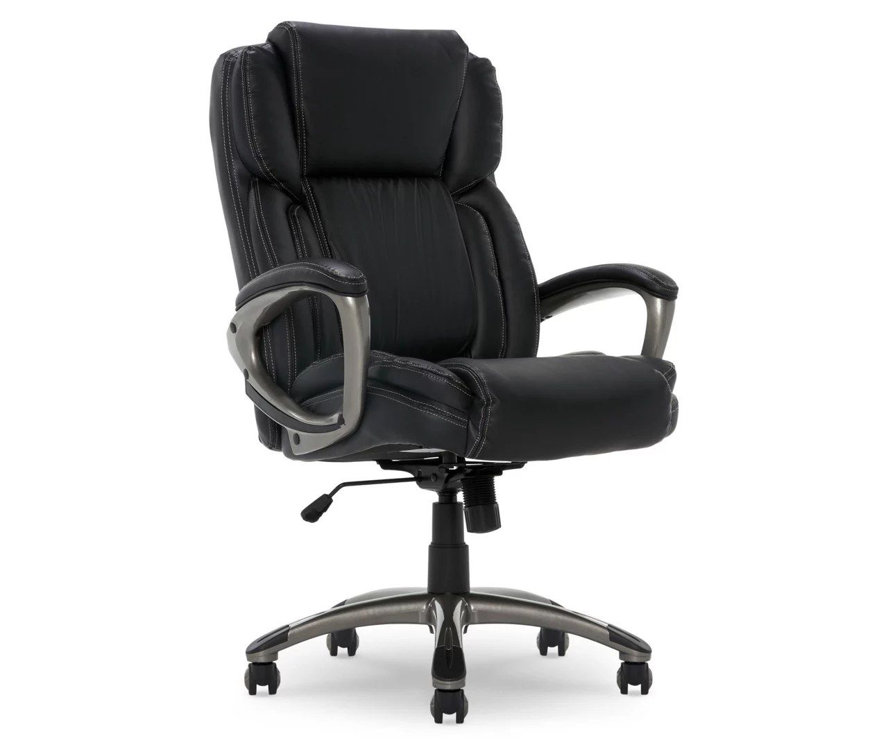 Bring relaxation to your busy workday with the Serta Executive Office Chair. Serta kept comfort in mind while designing this desk chair with luxurious layered body pillows, a contoured lumbar zone and padded armrests for all day ease and exceptional support during long periods of sitting. The waterfall seat edge reduces pressure on the back of the legs and increases circulation, which helps decrease fatigue while seated. The ergonomic office chair features both recline and seat-height adjustment settings, allowing you to find your optimal seating position. The heavy-duty painted base with scuff-resistant foot pads is designed for long-lasting, reliable use. This desk chair is upholstered in supple bonded leather with contrast stitching for comfort and style in any workspace.
