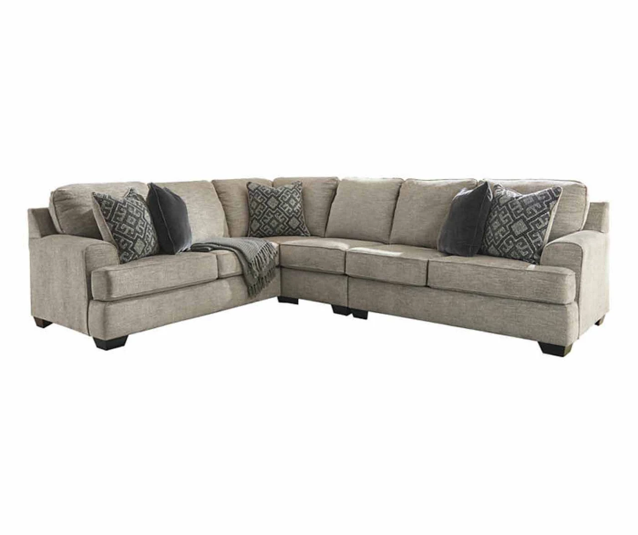 Whether your vision is clean and contemporary or cozy modern farmhouse, this sectional in a stone-tone neutral upholstery has the corner on style. Merging ultimate comfort with striking good looks, this chic sectional includes coordinating accent pillows for that much more feel-good allure.