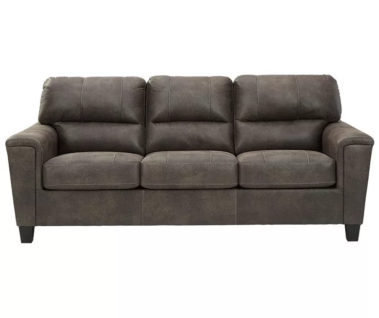 If you love the cool look of leather but long for the warm feel of fabric, you can take comfort in this sofa. Wrapped in a leather with a weathered hue and hint of pebbly texture to resemble the real deal, this decidedly modern sofa proves less is more. Elements include angled side profiling and track armrests wrapped with a layer of pillowy softness for that little something extra. Prominent jumbo stitching and clean-lined divided back styling lend fashion-forward flair.