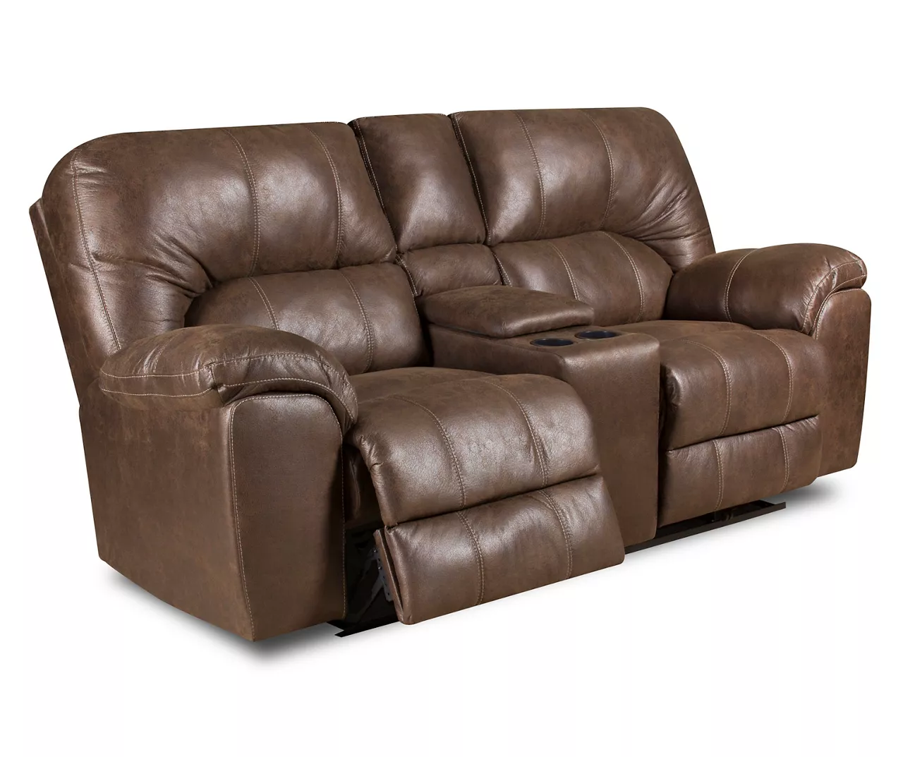 - Brown upholstered loveseat with storage console and 2 – cup holders