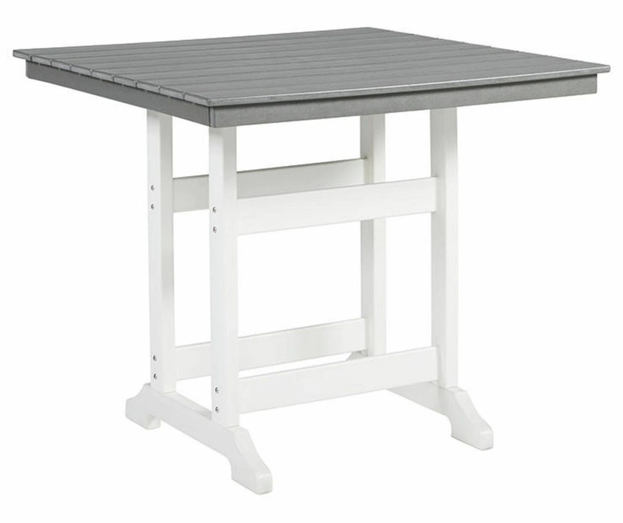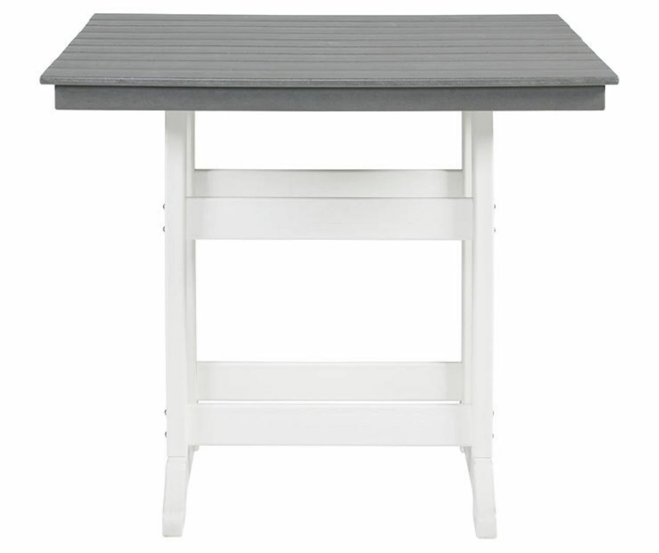 Raise the bar on outdoor living with this counter-height dining table. Crafted for style, comfort and Mega Tuff durability, it caters with a standout two-tone look that pairs gorgeous gray and crisp white for twice the interest. The table’s counter height design elevates the aesthetic. An umbrella hole lets you throw some shade on your outdoor living space.