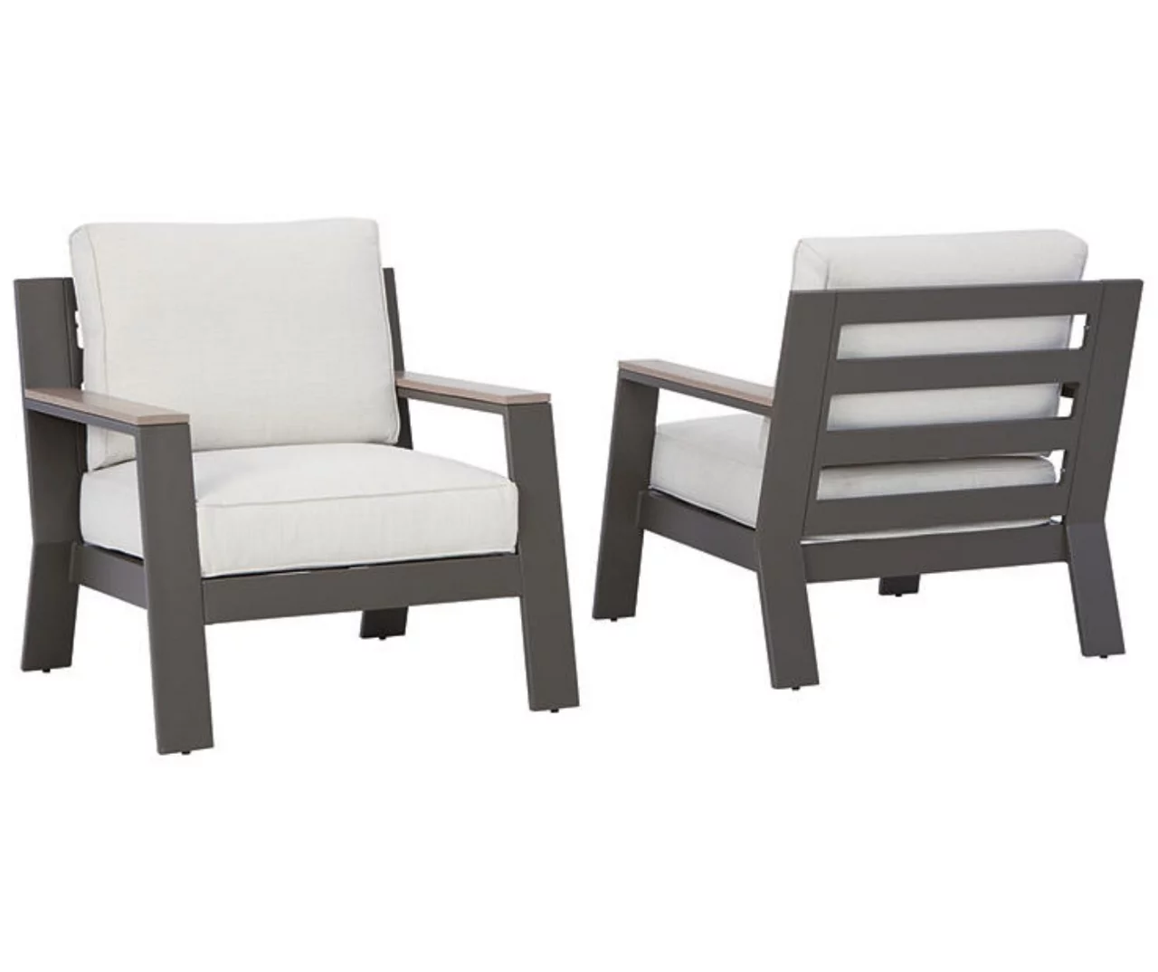 - Taupe colored frame with driftwood-like armrest accents