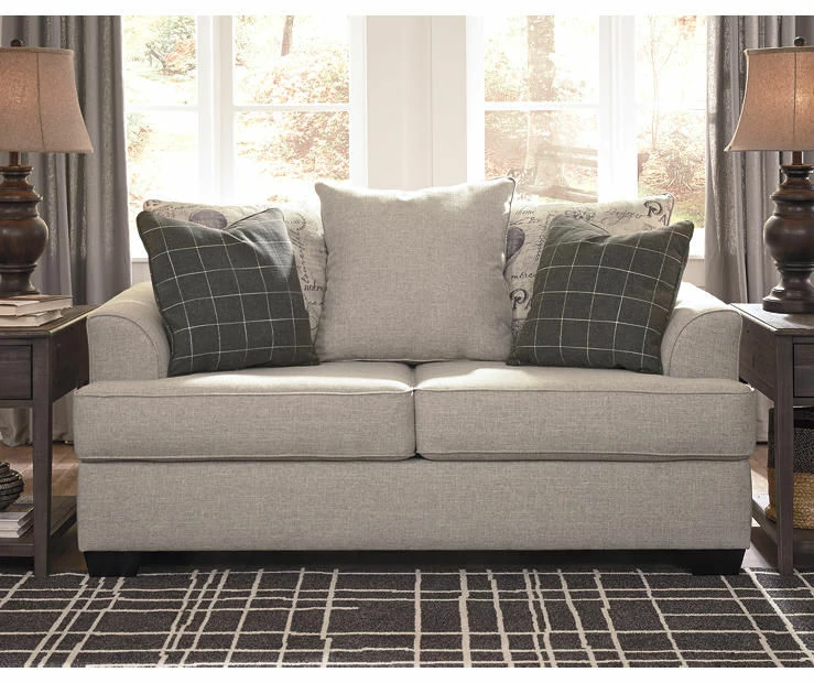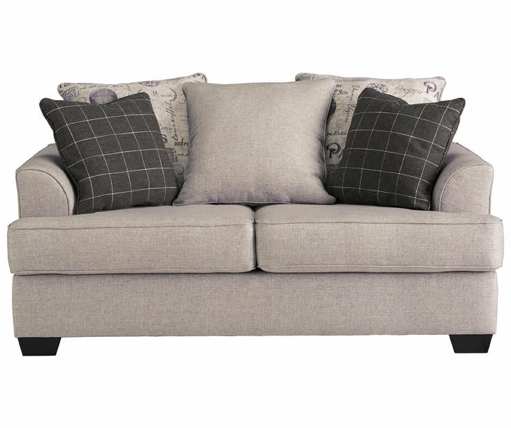 For the style enthusiast on a mission, the Velletri loveseat takes a unique approach to design. Two back cushions flaunt a vintage-inspired โParisโ script. Throw pillows continue the charm with gray-infused plaid patterns. Flared arms and neutral hue lend to transitional appeal. Covered in a luxurious linen-like chenille, its softness and luxurious comfort will keep you coming back.