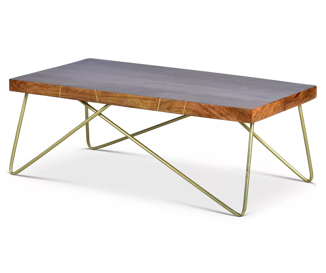 Look no further than the Walter coffee table for the hot urban look you need to update your space. Solid mango wood in a warm pine finish is inlaid with a brass “X” pattern atop a modern brass finished iron base. Simple yet so stylish.