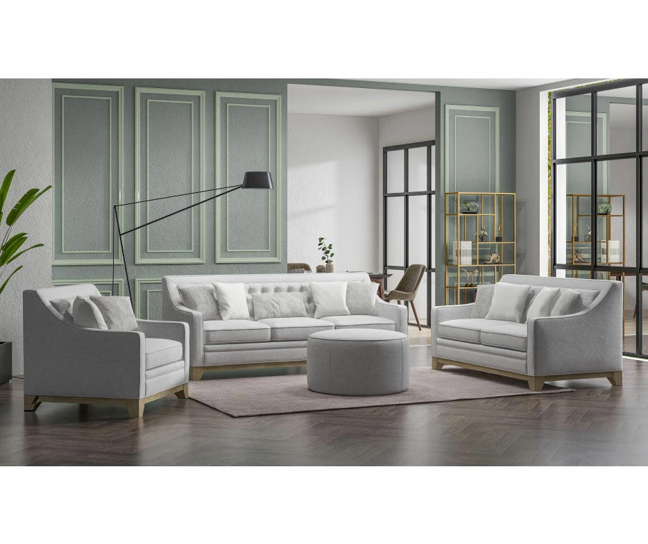This understated ottoman complements your living room décor. The white upholstery is decorated with light gray dots for a subtle coastal farmhouse look in your home. This ottoman is filled with foam and has springs in the seat for just the right amount of support as you sit or kick up your feet. Its solid pine and engineered wood frame creates a circular drum silhouette that sits right on your floor for a contemporary silhouette.