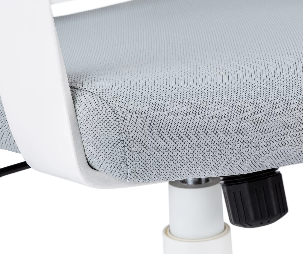 Increase your productivity with this chic and contemporary high back white executive office chair. This functioning swivel chair is upholstered in a sleek and breathable gray polyester fabric with a subtle honeycomb design and thick padding in all the right spots for ultimate comfort. The cushioned seat is adjustable to your desired height with a tilt back lock-in mechanism as the sturdy metal base with capped five nylon castors smoothly glides across the floor for easy mobility.